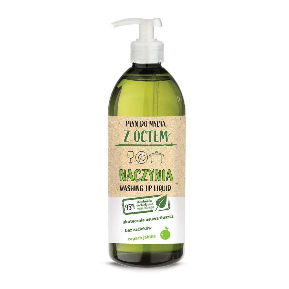 Płyn do mycia naczyń kuchennych z dodatkiem octu i świeżym jabłkowym zapachem. Przeznaczony do naczyń wykonanych ze szkła, metalu i tworzyw sztucznych. Skutecznie usuwa tłuszcz, pozostawiając naczynia czyste, lśniące i bez zacieków.